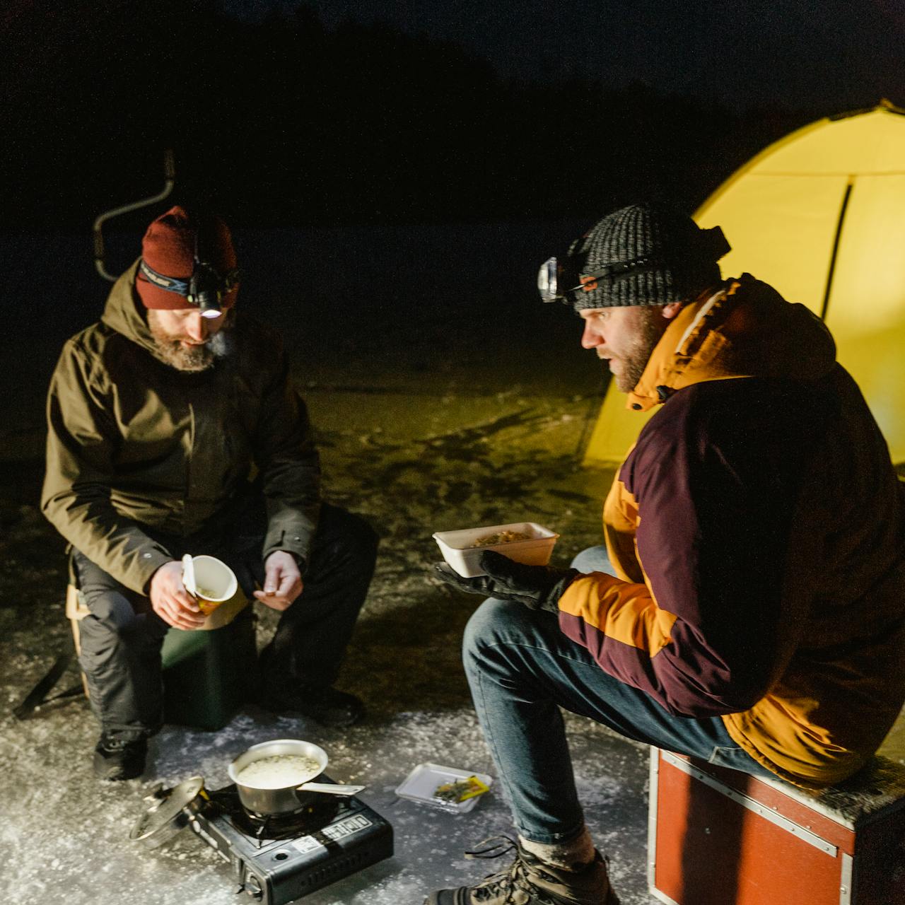 El viaje entre lagos es tan gratificante como la pesca misma. Ya sea con raquetas de nieve por estrechos senderos forestales o tirando del trineo por terreno abierto, estas transiciones ofrecen una conexión más profunda con el paisaje. La quietud del invierno invita a la reflexión, y tus pensamientos vagan tan libremente como el viento.
